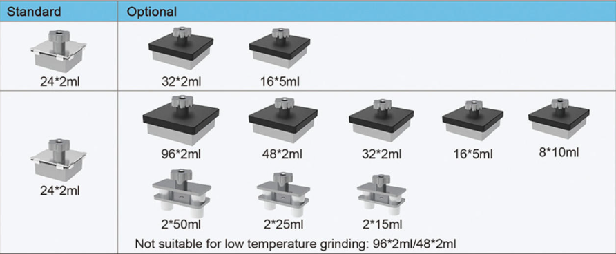 | Adaptador | Material de aleación de aluminioEstándar: 24*2mlOpcional (se puede personalizar): 32*2ml/16*5ml | Material de aleación de aluminio Estándar: 24*2 ml Opcional (se puede personalizar): 96*2 ml/48*2 ml/32*2 ml/16*5 ml/8*10 ml/2*15 ml/2*25 ml/2*50 ml |