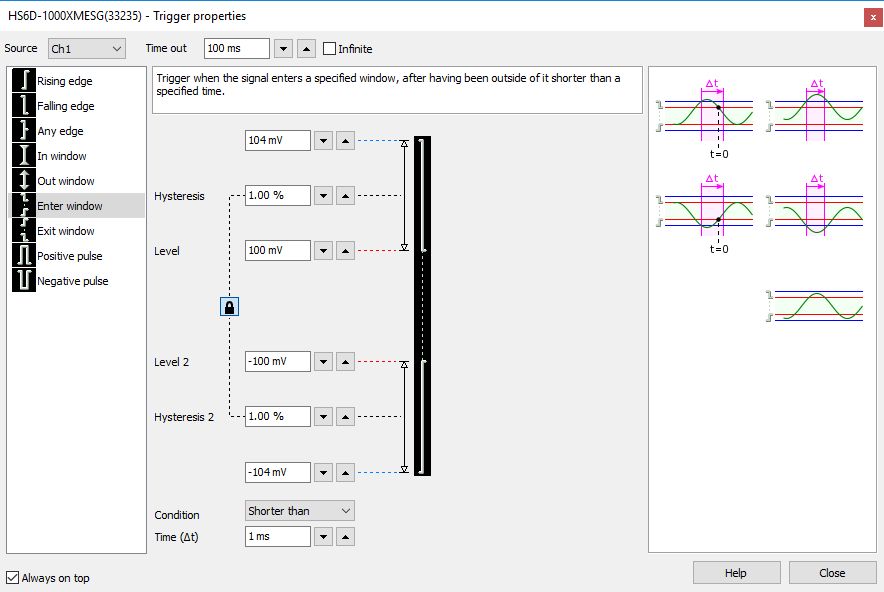 Para controlar las capacidades avanzadas de activación de su Handyscope, el software de osciloscopio multicanal proporciona un conveniente cuadro de diálogo de propiedades de activación. Permite ver y establecer todas las propiedades del activador, como por ejemplo, la fuente del activador, el tipo de activador, todos los niveles e histéresis y condiciones de tiempo opcionales. Además, proporciona una explicación sobre el tipo de activador seleccionado y ejemplos que sí provocan un activador (columna izquierda) y no causan un activador (columna derecha).