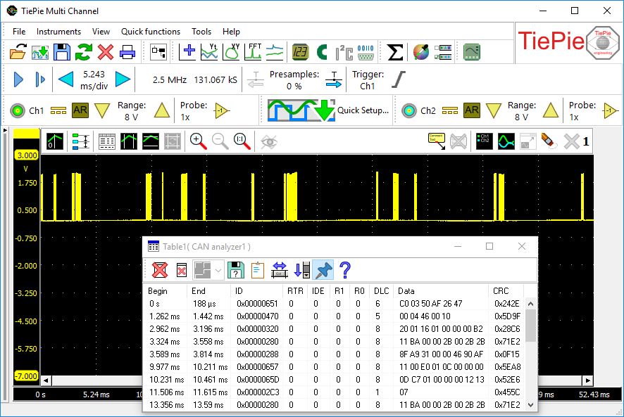 Para analizar o depurar sus comunicaciones en serie, simplemente mida la (s) señal (es) que transfieren el protocolo con su Handyscope y haga que sean analizadas y decodificadas por uno de los analizadores de protocolo de software de osciloscopio multicanal. La información decodificada de las comunicaciones en serie se puede mostrar en tablas, en gráficos y en el multímetro.