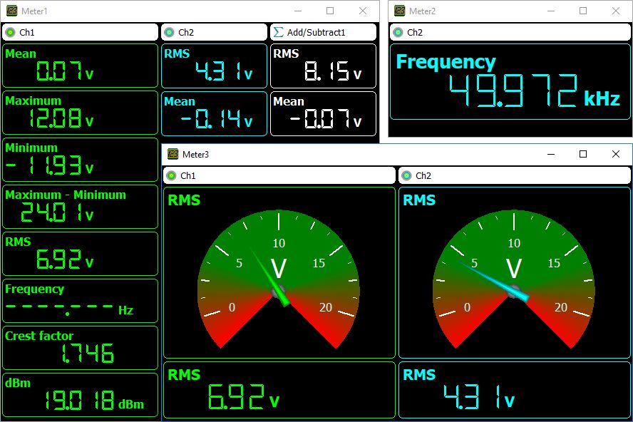 El multímetro en el software de osciloscopio multicanal convierte su Handyscope en un multímetro que se puede usar para medir o monitorear propiedades específicas de una señal, como el valor RMS verdadero, la frecuencia, el valor máximo, etc. pantallas configurables, ya sea mostrando el valor medido como un número o usando una pantalla de indicador. Cuando se utiliza una pantalla de indicador, puede ser muy útil al ajustar un circuito para una propiedad específica, por ejemplo, ajustar un desplazamiento a cero.