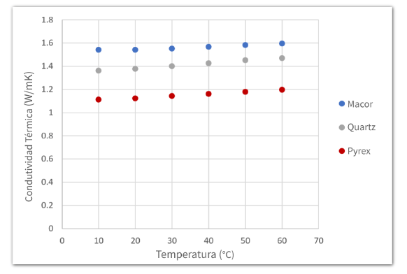 Con el equipo de alta conductividad térmica añadido, el HFM-100 es capaz de medir con precisión y eficiencia materiales de mayor conductividad térmica, como el vidrio y la cerámica. Para estas aplicaciones, se utiliza un kit de termopar externo en combinación con la muestra que se está probando. Macor, Quartz, y Pyrex fueron probados en el HFM desde 10 ̊C a 60°C (50°F a 140°F). Todos los valores medidos están dentro de la precisión indicada del sistema, +/- 5%.