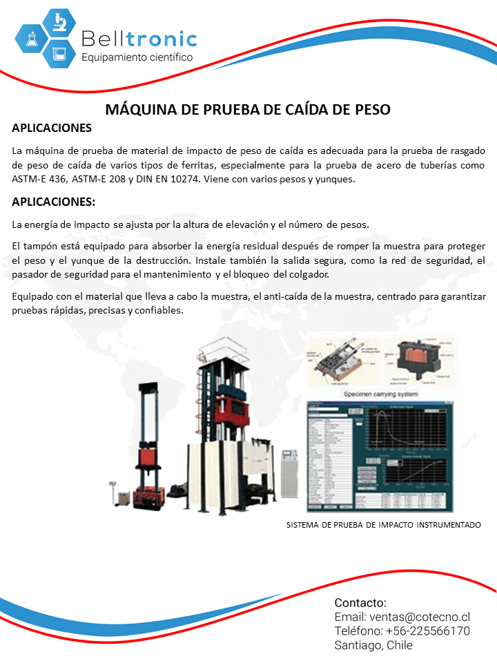 Equipado con equipo portamuestras, equipo anticaída para la muestra, equipo de centrado para garantizar pruebas rápidas, precisas y fiables.[/vc_column_text][/tab]Modelo,B02010128,B02010129,B02010130|Max.%20energ%C3%ADa%20(J),2000,40000,80000|Max.%20altura%20de%20elevaci%C3%B3n%20(mm),3000,2500,3000|Max.%20velocidad%20de%20impacto%20(m%20%2F%20s),7.6,7,7.5|Radio%20de%20curvatura%20de%20peso%20(mm),R25,R25.4%2B2.5,R25|Radio%20de%20curvatura%20del%20yunque%20(mm),R25,R14.3%2B1.59,R15|Hardnes%20de%20peso%20y%20yunque,%3EHRC58,HRC58-65,HRC58-65|Distancia%20entre%20soportes%20(mm),254,254,254|Desviaci%C3%B3n%20de%20centrado%20de%20la%20muestra%20(mm),%3C%2B1,%3C%2B1,%3C%2B1|Que%20indica%20la%20desviaci%C3%B3n%20de%20la%20altura%20de%20elevaci%C3%B3n%20(mm),%3C%2B1,%3C%2B1,%3C%2B1|Altura%20del%20bastidor%20de%20carga%20(mm),5500,5700,6800|Peso%20(kg),5600,9500,18000[/vc_table][/tab]