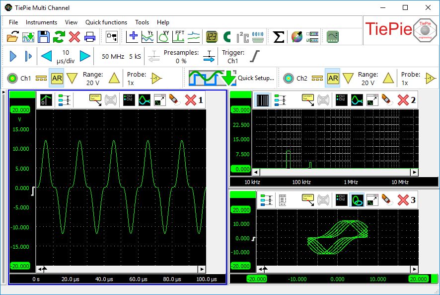 El alcance del software del osciloscopio multicanal, el analizador de espectro y el registrador de datos ofrecen una forma flexible de mostrar todos los aspectos de las señales medidas. Pueden tener uno o más gráficos, cada uno mostrando una o más señales, donde cada gráfico puede mostrar diferentes partes de una señal. Los gráficos pueden mostrar la (s) señal (es) de su Handyscope en modo Yt, en modo XY o como espectro de frecuencia, con o sin interpolación. Los colores de todos los elementos en un gráfico se pueden establecer en cualquier valor requerido. Las dimensiones del gráfico se pueden ajustar a cualquier tamaño requerido, los gráficos se pueden ubicar en una sola ventana o en ventanas separadas, que se pueden ubicar en cualquier parte del escritorio.[/vc_column_text][vc_column_text]Barras de herramientas amigables con pantalla táctil