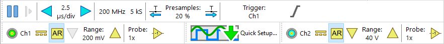 Una barra de herramientas de osciloscopio y barras de herramientas de canal están disponibles para cada Handyscope detectado. Las prácticas barras de herramientas proporcionan botones claros para todas las configuraciones del osciloscopio y sus canales. Muestran la configuración actual del osciloscopio y permiten cambiar todas las configuraciones. Los botones grandes son muy adecuados para la operación con pantalla táctil.
