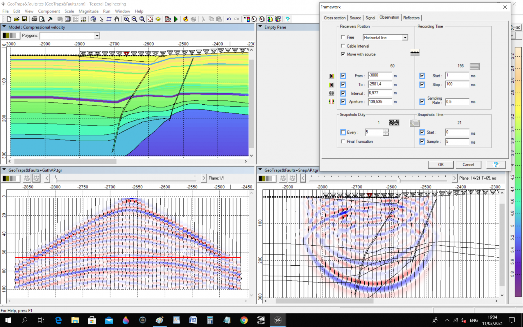 Tesseral Engineering permite a los usuarios personalizar de forma flexible la visualización de las colecciones sintéticas calculadas, ajustar la paleta y la ganancia de diferentes maneras, agregar ruido, cambios de tiempo aleatorios de trazas o simular la agrupación de receptores. Las herramientas integradas permiten evaluar la dinámica de la propagación de ondas en el modelo geológico y realizar un análisis detallado de los componentes del registro sísmico, así como determinar las características de las ondas deseadas y las ondas de interferencia en las reuniones sísmicas sintéticas y reales. También es posible ordenar trazas, convertir de tiempos a profundidades y hacia atrás, dividir o combinar reuniones sísmicas y calcular sus diferencias. Los datos sintéticos calculados se guardan en formato SEG-Y. El usuario también puede visualizar la propagación de los frentes de onda en el cuerpo del modelo, así como guardarlo en forma de instantáneas o videos.