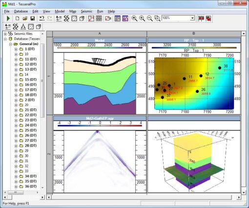 Tesseral Pro está diseñado para el modelado de onda completa 2D, 2.5D y 3D de datos sísmicos por métodos de diferencias finitas, sistema de planificación de observaciones y procesamiento de datos. El programa le permite configurar cualquier sistema de observación, construir modelos complejos de profundidad del entorno geológico utilizando datos GIS, mapas de superficies geológicas o modelos de velocidad sísmica 2D y 3D. Tesseral Pro ofrece un enfoque ingenioso para el desarrollo de modelos de capa delgada que ofrece una alta precisión y validez del modelo a la vez que es simple y rápido de construir. Para ello, datos de registro de pozos, posición espacial e inclinación de pozos, columnas estratigráficas, mapas de horizonte, etc. se utilizan.